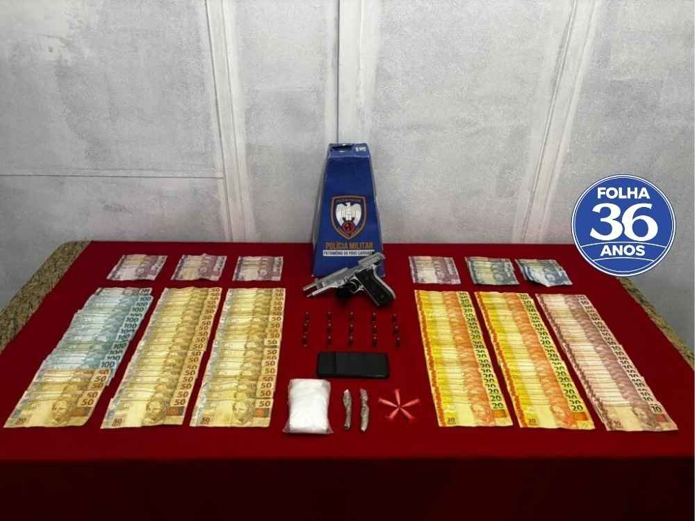 A equipe identificou pela janela material semelhante à maconha na sacola, caracterizando flagrante e autorizando buscas dentro da residência. Com a presença de um familiar, os policiais encontraram uma pistola calibre .380 prateada, com carregador e 15 munições. A Polícia Militar apreendeu também drogas, dinheiro e materiais para endolação.