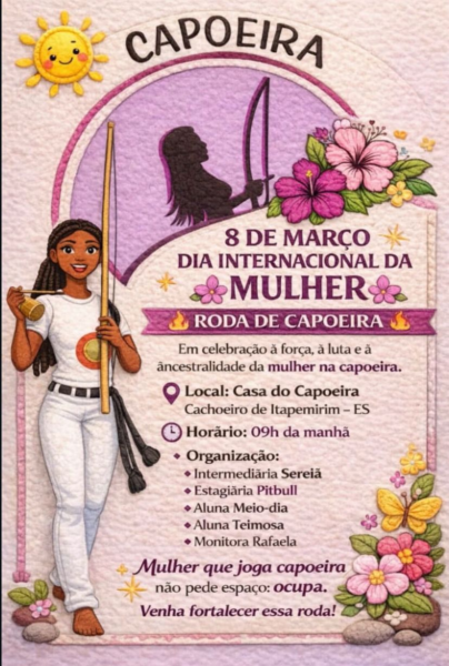 Uma roda de capoeira especial marcará as celebrações do Dia Internacional da Mulher em Cachoeiro de Itapemirim. O evento acontecerá no próximo dia 08 de março, a partir das 09h da manhã, na Casa do Capoeira. De fato, a iniciativa busca homenagear a força, a luta e a ancestralidade feminina dentro da modalidade. Sob o lema de que a mulher que joga capoeira ocupa o seu espaço, o encontro convida os moradores para fortalecer essa manifestação cultural.