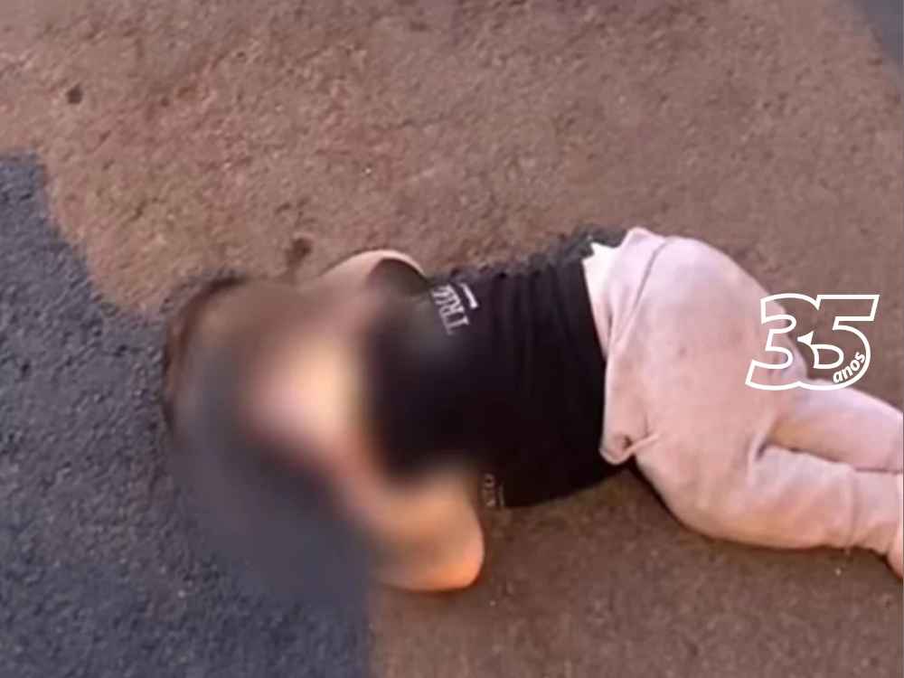 Nas imagens, é possível ver o bebê sentado no chão. Em outra, a criança aparece deitada no asfalto.