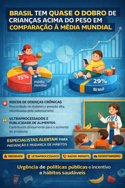 O Brasil registra quase o dobro de crianças e adolescentes acima do peso em comparação com a média global. Segundo dados recentes, o índice de obesidade e sobrepeso nessa faixa etária cresceu de forma alarmante nas últimas décadas. Por isso, especialistas alertam para a necessidade urgente de políticas públicas voltadas à alimentação saudável e ao incentivo de atividades físicas desde a infância.