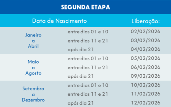 A segunda etapa contemplará o saldo remanescente estimado em cerca R$ 4,6 bilhões. O pagamento será realizado de forma escalonada entre 2 e 12 de fevereiro de 2026, conforme dia e mês de nascimento: