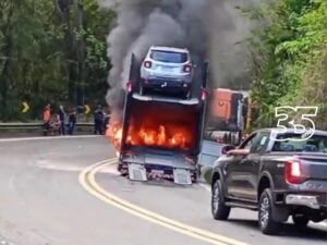 Assista: carreta cegonha pega fogo e interdita o trânsito da BR-262