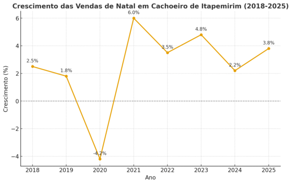 Entre 2018 e 2025, o comércio natalino de Cachoeiro oscilou bastante. Houve retração em 2020, com a pandemia, seguida de forte recuperação em 2021. Nos últimos anos, o desempenho tem sido positivo, embora moderado. A projeção para 2025 é de crescimento entre 3% e 5%, confirmando a retomada gradual do setor.
